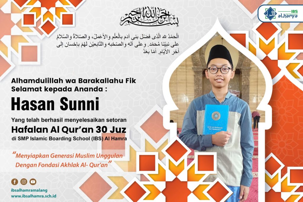 Alhamdulillah wa Barakallahu fik… Selamat kepada ananda : *MUHAMMAD FAIZ ALFARIZI* Yang telah berhasil menyelesaikan setoran hafalan Al Qur’an 30 juz dalam waktu 3 semester di SMP Islamic Boarding School (IBS) Al Hamra. Semoga Allah berkahi Ananda dan Ayah-Bundanya dan Allah jaga hafalan Ananda hingga akhir hayatnya. IBS Al HAMRA: “Menyiapkan Generasi Muslim Unggulan dengan […]